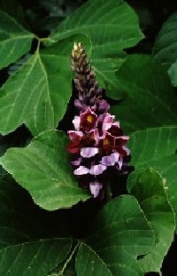The leaves of kudzu grow thick and alternate, and they are green in color with rough hair sparsely covering them. The back of the leaves can be seen with whitish color and bristly white hair. In autumn, it stands bunch flower 15-18cm in length and blooms purple butterfly-shaped flowers. The flower blooms sequentially from the bottom, and it has a length of 18-20mm. The calyx has a pale purple color. The flower turns into a fruit that has a linear shape and a length of 5-10cm. It is covered with rough brown hair.