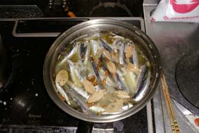 次の日の朝 鍋を火に掛け だし汁を採る。その後 網でいりこを出す。