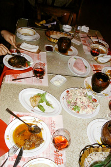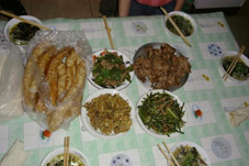 小豆がはいったもの、まめが入った物・・・・10種類ぐらいのお粥がならび、その横におかずが20種類ぐらい並んでいた。おかずはピーナツの炒めた物、鶏の鶏冠の炒め物など頼んだ。息子は果物が入った冷たいお粥にしたのだが、甘くて食べられなかったようだ。ねじった揚げパンも食べた。