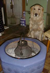 日頃 床にあがれないウィンディーも当家24節気のひとつ「犬床にあがる」の日以降は晴れて台所の床に上がることが出来る。夜は火鉢の横で眠り、朝は火鉢の横で起きる。昼間は日の当たる暖かい庭で日向ぼっこしているが、夕方になるとドアを叩き、入れてくれと懇願する。家族の中で最も火鉢に接近し、暖を摂る。