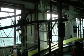 吊り下げ框 ワイヤー綜絖で 間長は長い。 シナ織は織った布は女巻きに巻かず下に下ろしてゆく