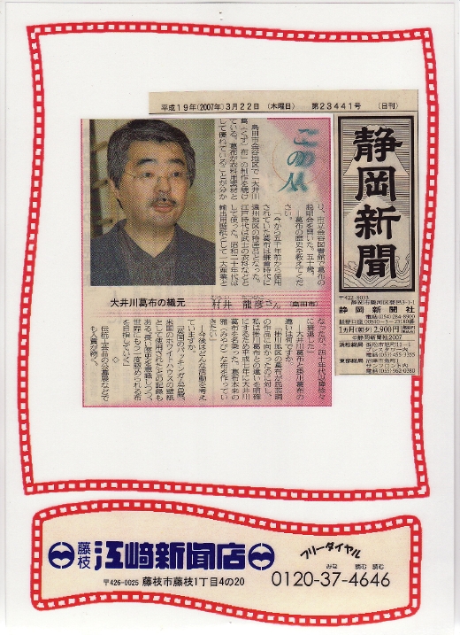 産経新聞 2007年6月12日 全国版 静岡新聞 2007年3月22日 2007年3月13日 静岡新聞 掲載雑誌メニュー Home掲載雑誌Top和樂ココラボ通信七緒チルチンびと26号チルチンびと20号光の泉掲載記事まとめ1掲載記事まとめ2七宝の塔掲載記事まとめ4美しいキモノ民芸の教科書花咲くnid2004キモノサロン2015すてきにハンドメイド