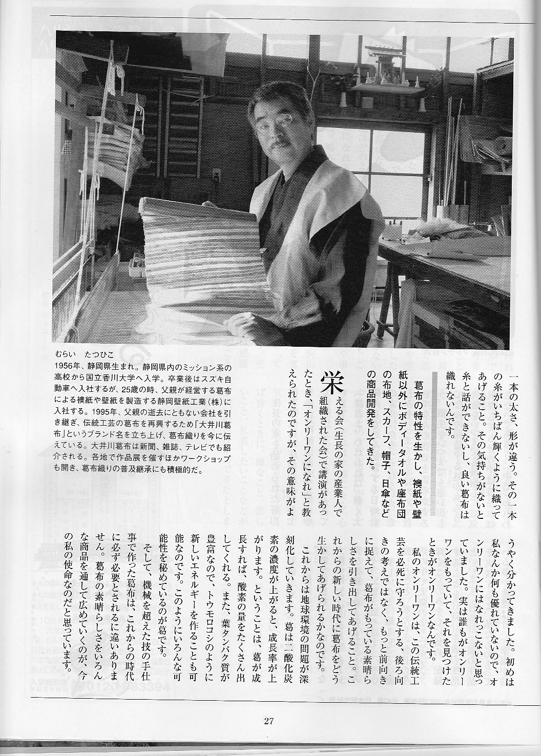 ■理想世界 2010年3月号 スペシャリストの熱き心 葛布にかける使命感 掲載雑誌メニュー Home掲載雑誌Top和樂ココラボ通信七緒チルチンびと26号チルチンびと20号光の泉掲載記事まとめ1掲載記事まとめ2七宝の塔掲載記事まとめ4美しいキモノ民芸の教科書花咲くnid2004キモノサロン2015すてきにハンドメイド