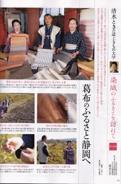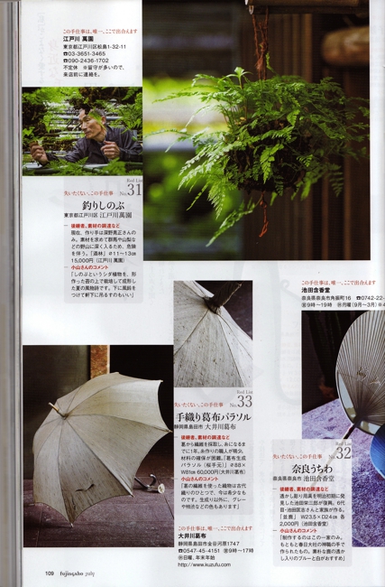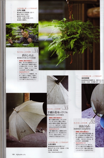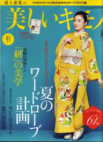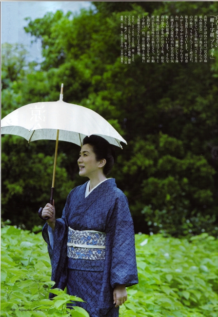 2014年8月号 婦人画報 パラソルが掲載されました。 宮古上布を着た女優の真野響子さんがお持ちになりました。 美人に葛布パラソル 素敵です。 実は2年前も真野響子さんがお持ちになり 婦人画報に載ったのですが、そのときは とても小さく写っていました。 再びのコラボですが、きっと彼女が気に入ってくれていたのでしょう。 宮古上布は 産地連絡会でご一緒している 宮古織物事業協同組合さんのもの。 身内みたいなものです。 ですから このコラボも嬉しいです。 婦人画報2014年7月号 葛布のパラソルが掲載されました 美しいキモノ2014年夏号 葛布の帯が掲載されました。 美しいきもの 2010年春号 清水とき の誌上きもの大学 染織のふるさとを訪ねて 葛布のふるさと 静岡へ 掲載雑誌メニュー Home掲載雑誌Top和樂ココラボ通信七緒チルチンびと26号チルチンびと20号光の泉掲載記事まとめ1掲載記事まとめ2七宝の塔掲載記事まとめ4美しいキモノ民芸の教科書花咲くnid2004キモノサロン2015すてきにハンドメイド