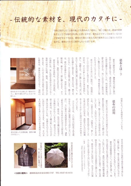 『ココラボ通信』2011年12月号 「 木の家造りを通じて暮らしを提案する」、 こころ木造建築 さん発行の情報誌、『ココラボ通信』。 葛布を2枚のガラスに挟んだ「 葛布ガラス 」を紹介していただきました。 あたたかい木の家と、葛布のやわらかい透け感がよく合っていますね。 自然の素材感が良い 程よい目隠しになる ということで、入り口や仕切りなどに使って頂いております。 「葛布を家に使いたいけど、ふすまなんてないし・・・」 という方にもおすすめです。 こころ木造建築さんのHPはこちら 掲載雑誌メニュー Home掲載雑誌Top和樂ココラボ通信七緒チルチンびと26号チルチンびと20号光の泉掲載記事まとめ1掲載記事まとめ2七宝の塔掲載記事まとめ4美しいキモノ民芸の教科書花咲くnid2004キモノサロン2015すてきにハンドメイド