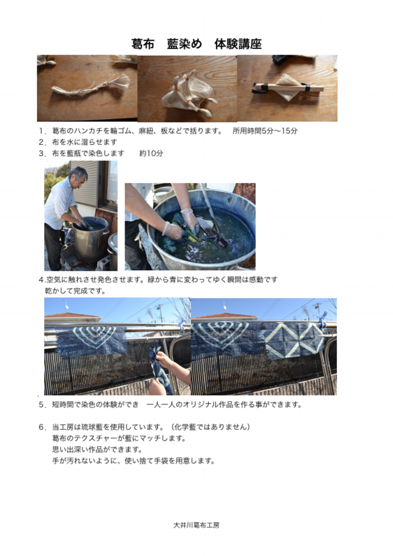 緑色の藍が 青に変化する瞬間は感動です。染めた葛布ハンカチは持ち帰りできます。